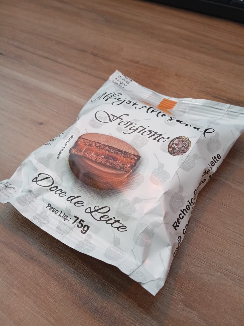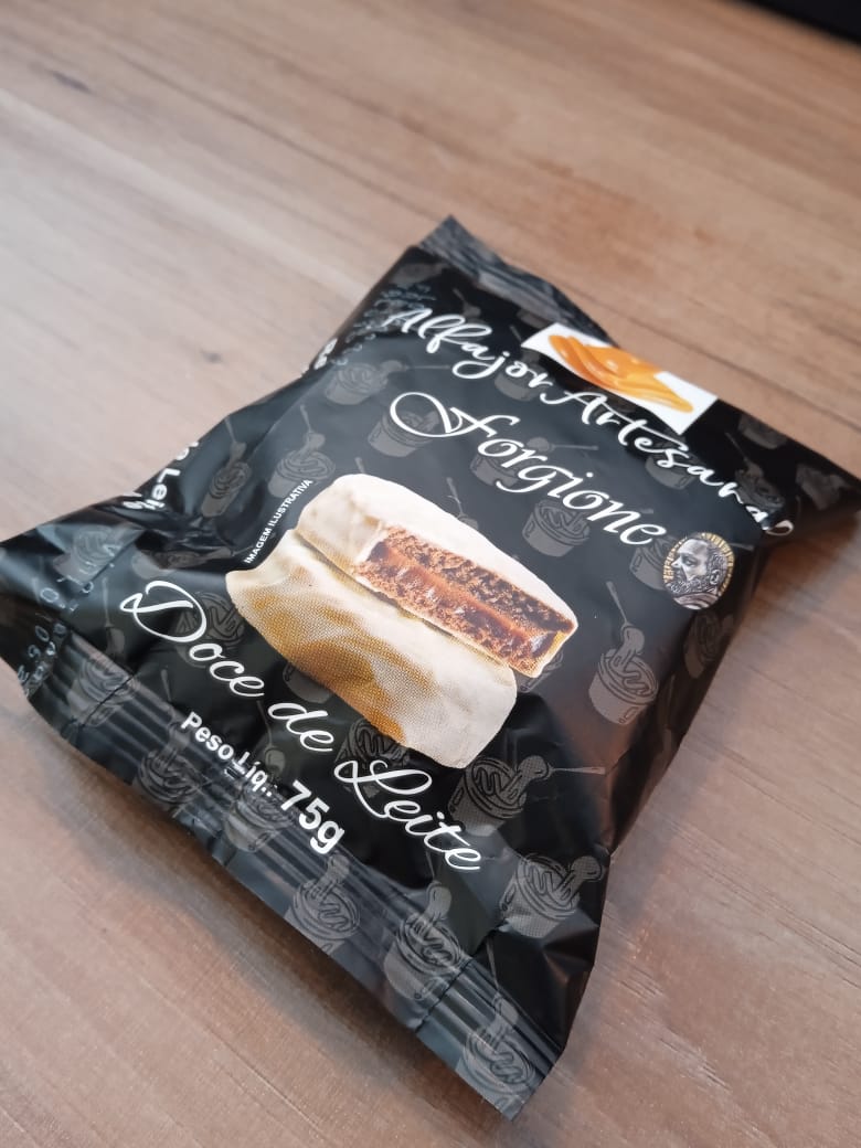 Alfajor recheado com doce de leite coberto com chocolate meio amargo.