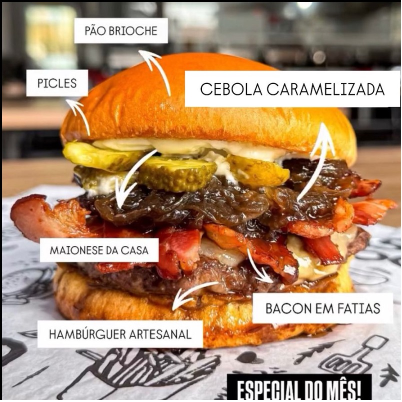 PÃO BRIOCHE, MAIONES, HAMBURGUER, QUEIJO, BACON FATIADO, CEBOLA CARAMELIZADA E PICLES.