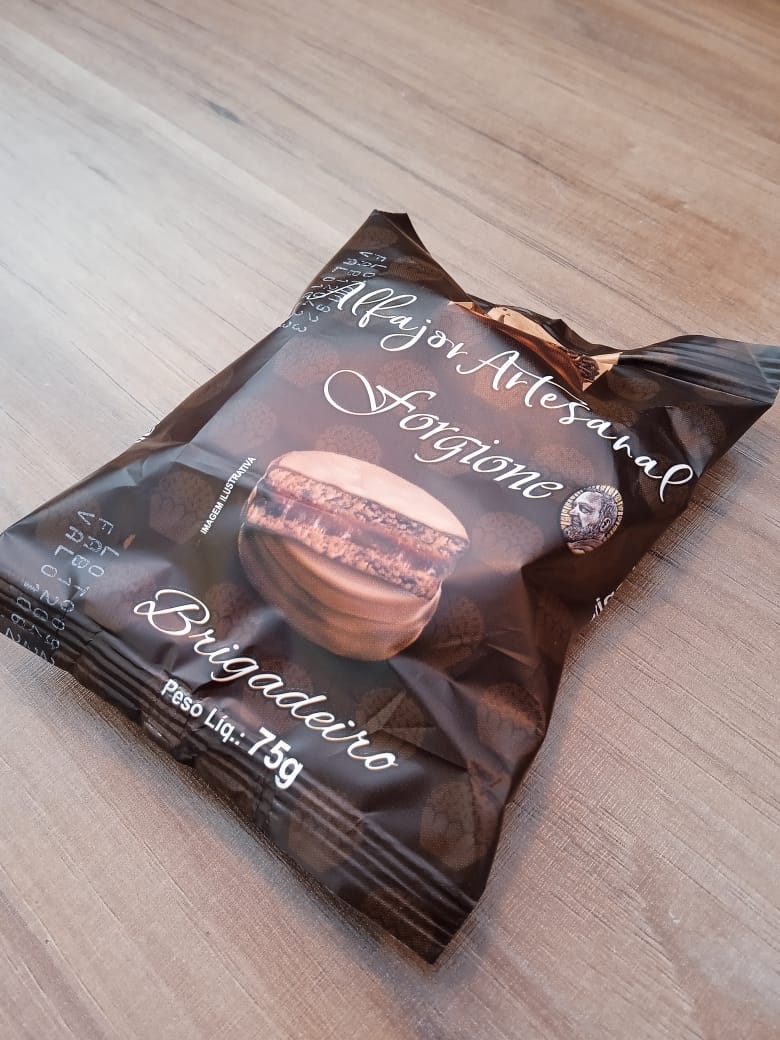 Alfajor recheado de brigadeiro coberto com chocolate meio amargo.