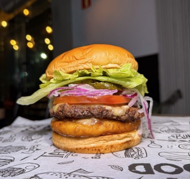BROA GOURMET COM GERGELIM, MAIONESE CASEIRA, 2 HAMBURGUERES DE FRALDINHA, QUEIJO MUSSARELA.